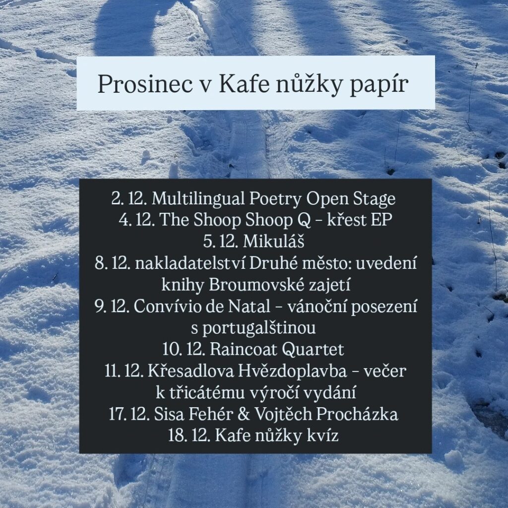 Gostas da língua portuguesa como nós? Vem ao encontro natalicio no café Kafe nůžky papír! na terça-feira 9 de dezembro às 18h30! Vamos falar em português, ouvir uma playlist dos países lusófonos e celebrar o Natal juntos!